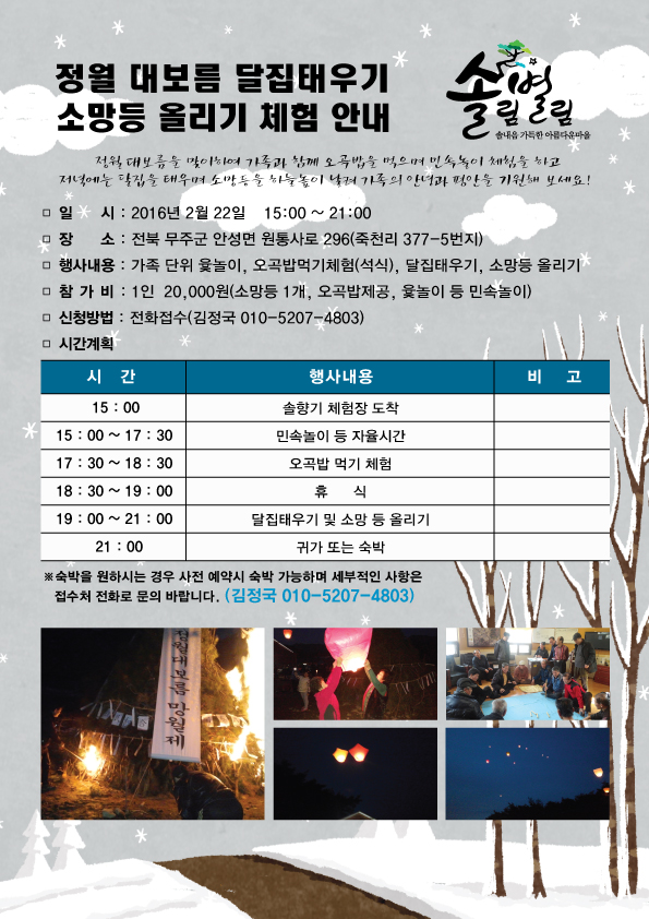 행사내용 : 가족단위 윷놀이, 오곡밥먹기체험(석식), 달집태우기, 소망등 올리기